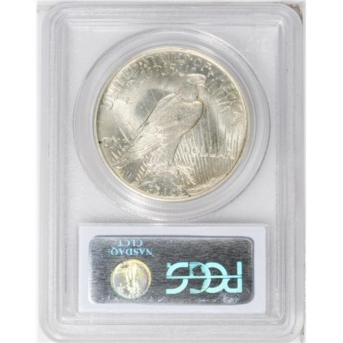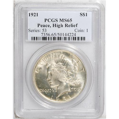 <B>1921<img border='0' src='http://www.heritagecoins.com/images/star.gif' width=10 height=10>$1> MS65 PCGS.</B></I> A well struck Gem with frosty luster that breaks between the L and I of LIBERTY. A small, dark spot is noted to the left of the O in ONE, and an abrasion appears to the left of the eagle.