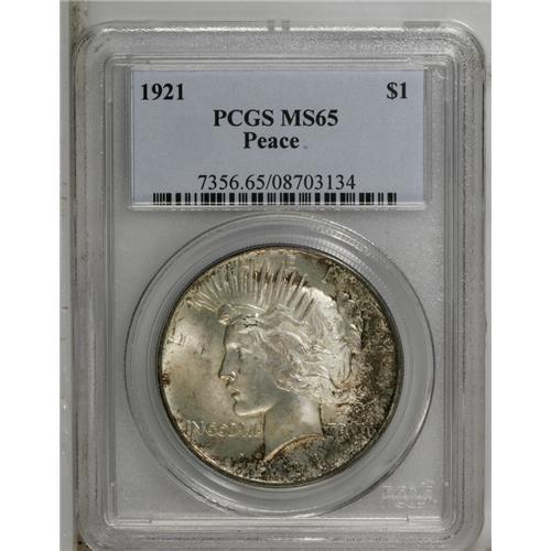 <B>1921<img border='0' src='http://www.heritagecoins.com/images/star.gif' width=10 height=10>$1> MS65 PCGS.</B></I> Dappled olive-gray and burnt-orange patina occupies portions of the borders of this lustrous Peace dollar. Minimally marked with just a trace of central striking weakness.