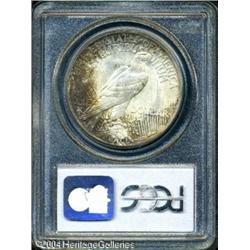 1921 S$1 MS65 PCGS. Russet-brown patina sweep acro <B>1921 S$1 MS65 PCGS.</B></I> Russet-brown patina sweep across the borders of this shimmering Gem, which otherwise exhibits pearl-gray color. The hair above the ear has decent definition for this often mushy issue, and the obverse in particular is exceptionally preserved. A mark on the eagle's wing is well concealed. <BR><BR><B>Important notice:</B> Heritage usually auctions material at the rate of 200-250 lots per hour. On some occasions eBay Live bid software or the Internet may not be able to keep up with the pace of the auction. We recommend placing a realistic absentee bid now as insurance to avoid disappointment. Occasionally the auctioneer may eliminate or reject an eBay Live bid, and the auctioneer may also reopen a lot after the close of the eBay live bidding (usually because we missed an audience bid), and may reject your bid even if it shows you as the winning bidder. By bidding via eBay Live, you agree that Heritage may award the lot to another bidder at its sole discretion under the circumstances described above or any other reasonable circumstances. Since eBay bids are not shown to us until we open the lot on the floor, we treat those bids just like floor bids. In most cases the floor responds before the eBay bid is presented to us, due to Internet lag time, so for consistency we have made it a policy that floor bids are always considered first over tie eBay live bids. Also please note that all Heritage lots purchased through eBay Live carry a 20% Buyer's Premium. Please make sure you read the Terms and Conditions before you bid. This lot is being auctioned in conjunction with a live floor auction by Heritage Galleries & Auctioneers. All final auction and invoice information will be supplied by Heritage Galleries & Auctioneers, and all other information should be considered preliminary. Lot:7776