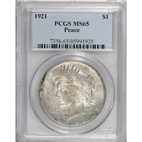 <B>1921 S$1 MS65 PCGS.</B></I> This lovely representative derives from the high-relief one-year subtype. Speckles of olive-green and reddish-brown color visit the intensely lustrous surfaces. A pleasing Gem that displays only minor softness at the usual trouble spots.<BR><BR><b>Shipping:</b> Coins & Currency (<a target="_blank" href="http://www.heritageauctions.com/common/shipping.php">view shipping information</a>)