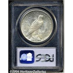 <B>1921<S$1> MS65 PCGS.</B></I> A hint of gold color and an above average strike combine with potent luster and undisturbed fields. An impressive example of this first year, high relief Peace Dollar. <BR><BR><B>Important notice:</B> Heritage usually auctions material at the rate of 200-250 lots per hour. On some occasions eBay Live bid software or the Internet may not be able to keep up with the pace of the auction. We recommend placing a realistic absentee bid now as insurance to avoid disappointment. Occasionally the auctioneer may eliminate or reject an eBay Live bid, and the auctioneer may also reopen a lot after the close of the eBay live bidding (usually because we missed an audience bid), and may reject your bid even if it shows you as the winning bidder. By bidding via eBay Live, you agree that Heritage may award the lot to another bidder at its sole discretion under the circumstances described above or any other reasonable circumstances. Since eBay bids are not shown to us until we open the lot on the floor, we treat those bids just like floor bids. In most cases the floor responds before the eBay bid is presented to us, due to Internet lag time, so for consistency we have made it a policy that floor bids are always considered first over tie eBay live bids. Also please note that all Heritage lots purchased through eBay Live carry a 20% Buyer's Premium. Please make sure you read the Terms and Conditions before you bid. </span></font></tr></table></td></tr></table>