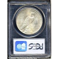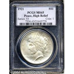 <B>1921<S$1> MS65 PCGS.</B></I> An exceptional 1921 Peace dollar with a fairly bold strike for the type and gorgeous luster. The clean surfaces have a whisper of golden-pink tone to them and the overall look is very Gem. <BR><BR><B>Important notice:</B> Heritage usually auctions material at the rate of 200-250 lots per hour. On some occasions eBay Live bid software or the Internet may not be able to keep up with the pace of the auction. We recommend placing a realistic absentee bid now as insurance to avoid disappointment. Occasionally the auctioneer may eliminate or reject an eBay Live bid, and the auctioneer may also reopen a lot after the close of the eBay live bidding (usually because we missed an audience bid), and may reject your bid even if it shows you as the winning bidder. By bidding via eBay Live, you agree that Heritage may award the lot to another bidder at its sole discretion under the circumstances described above or any other reasonable circumstances. Since eBay bids are not shown to us until we open the lot on the floor, we treat those bids just like floor bids. In most cases the floor responds before the eBay bid is presented to us, due to Internet lag time, so for consistency we have made it a policy that floor bids are always considered first over tie eBay live bids. Also please note that all Heritage lots purchased through eBay Live carry a 20% Buyer's Premium. Please make sure you read the Terms and Conditions before you bid. </span></font></tr></table></td></tr></table>