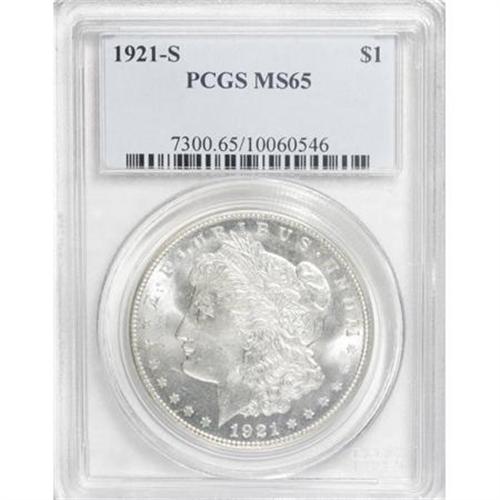<B>1921-S $1 MS65 PCGS.</B></I> Better struck than the usual '21-S dollar, with only softness limited to small portions of the wreath and claws. A lustrous and unabraded Premium Gem with a few pinpoint ebony freckles.<BR><BR><b>Shipping:</b> Coins & Currency (<a target="_blank" href="http://www.heritageauctions.com/common/shipping.php">view shipping information</a>)