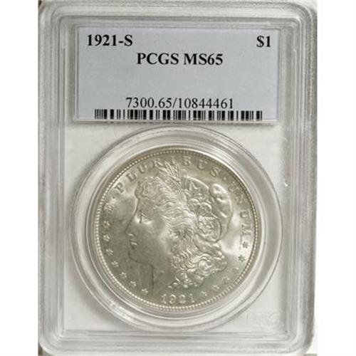 <B>1921-S $1 MS65 PCGS.</B></I> Delicate olive-gold toning visits this carefully preserved and lustrous final-year Morgan dollar. The 1921-S is a notoriously softly struck issue, particularly on the wreath, but the present example has remarkably strong detail. PCGS has certified just 24 finer pieces (10/07).<BR><BR><b>Shipping:</b> Coins & Currency (<a target="_blank" href="http://www.heritageauctions.com/common/shipping.php">view shipping information</a>)