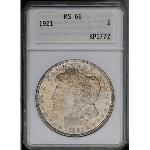 <B>1921<img border='0' src='http://www.heritagecoins.com/images/star.gif' width=10 height=10>$1> MS66 ANACS.</B></I> Delicately toned in ice-blue and light copper-gold, with a fine-grained, satiny appearance and a better than average strike on the lower wreath leaves, often weak on this issue. <BR><BR><B>Important notice:</B> Heritage usually auctions material at the rate of 200-250 lots per hour. On some occasions eBay Live bid software or the Internet may not be able to keep up with the pace of the auction. We recommend placing a realistic absentee bid now as insurance to avoid disappointment. Occasionally the auctioneer may eliminate or reject an eBay Live bid, and the auctioneer may also reopen a lot after the close of the eBay live bidding (usually because we missed an audience bid), and may reject your bid even if it shows you as the winning bidder. By bidding via eBay Live, you agree that Heritage may award the lot to another bidder at its sole discretion under the circumstances described above or any other reasonable circumstances. Since eBay bids are not shown to us until we open the lot on the floor, we treat those bids just like floor bids. In most cases the floor responds before the eBay bid is presented to us, due to Internet lag time, so for consistency we have made it a policy that floor bids are always considered first over tie eBay live bids. Also please note that all Heritage lots purchased through eBay Live carry a 20% Buyer's Premium. Please make sure you read the Terms and Conditions before you bid. This lot is being auctioned in conjunction with a live floor auction by Heritage Galleries & Auctioneers. All final auction and invoice information will be supplied by Heritage Galleries & Auctioneers, and all other information should be considered preliminary. Lot:3794 <BR><BR><B>Winning Notification and Billing:</B> After the FINAL session in this auction is complete, Heritage will send e-mail and snail mail invoices. This process normally takes several days. All final auction and invoice information will be supplied by Heritage Galleries & Auctioneers, and all other information should be considered preliminary. <BR><BR>This auction will be conducted on a live auction floor and over the Internet through eBay Live. If you choose to place an absentee bid, please take a moment to <font color='#0000ff'><u><a href='http://pages.ebay.com/liveauctions/help/before/laabsentee.html'>learn how eBay Live absentee bidding works</a></u></font><font color='#000000'>