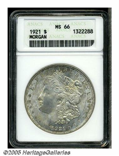 <B>1921<S$1> MS66 ANACS.</B></I> Generally well struck, for the issue, if slightly weak on some of the peripheral letters, and on the lower left portions of the wreath, this premium Gem has a bright, satiny appearance, with minimal surface marks and dappled, variegated, creamy coloration over both sides.