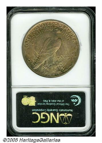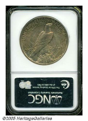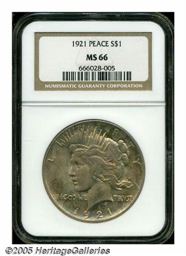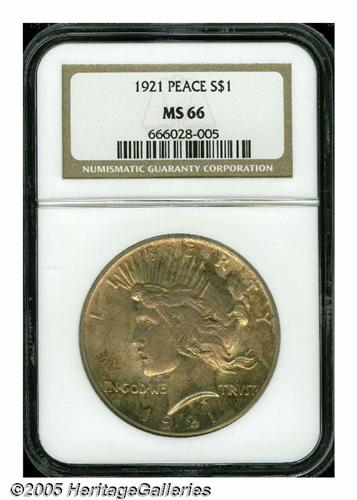 <B>1921<S$1> MS66 NGC.</B></I> In addition to being the first year of issue for the new Peace dollar design, the 1921 is also the only year this design was struck in high relief. For some reason unknown to us, the High Relief double eagle has always received accolades from collectors, even in the year of issue, but the High Relief Peace dollar is greeted with little more than a yawn by most collectors. Just over a million pieces were produced, and as one would expect, high grade, well struck examples are very elusive. This piece shows strong striking details for the issue with rich, frosted mint luster. Both sides are covered with attractive reddish-golden and lilac toning that, not only assures the viewer of originality, but also enhances the overall attractiveness of this special coin. Population: 70 in 66, 6 finer (4/05).
