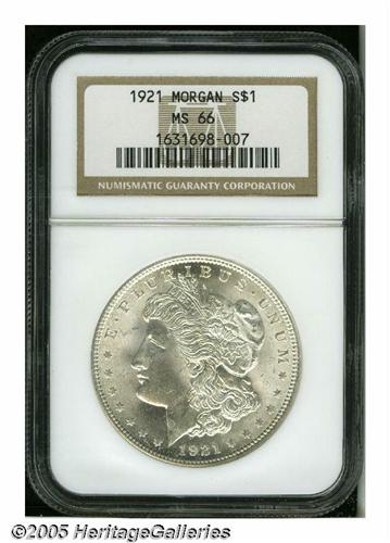 <B>1921<S$1> MS66 NGC.</B></I> The strike is razor-sharp, and the surfaces are fully brilliant save for a glimpse of russet color behind the eagle's neck. A common date, but a finer example would not be easy to locate.