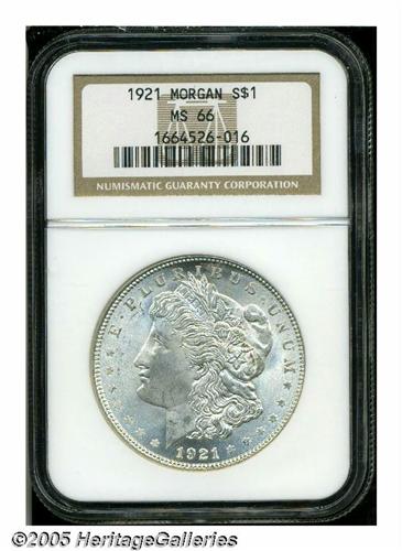 <B>1921<S$1> MS66 NGC.</B></I> Truly stunning, frosty, snow-white color with a razor sharp strike and a tiny mark, or two, on Liberty's face that limit the grade on this upper end Gem example. NGC has certified only 12 pieces finer (5/05).