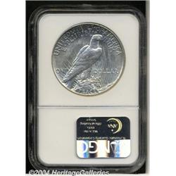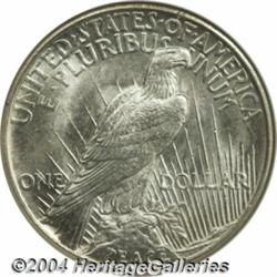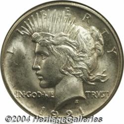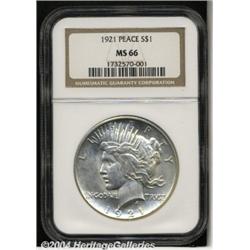 <B>1921<S$1> MS66 NGC.</B></I> Brilliant and essentially untoned. Nicely struck, with a touch of softness in the centers, and minimally abraded surfaces. <BR><BR><B>Important notice:</B> Heritage usually auctions material at the rate of 200-250 lots per hour. On some occasions eBay Live bid software or the Internet may not be able to keep up with the pace of the auction. We recommend placing a realistic absentee bid now as insurance to avoid disappointment. Occasionally the auctioneer may eliminate or reject an eBay Live bid, and the auctioneer may also reopen a lot after the close of the eBay live bidding (usually because we missed an audience bid), and may reject your bid even if it shows you as the winning bidder. By bidding via eBay Live, you agree that Heritage may award the lot to another bidder at its sole discretion under the circumstances described above or any other reasonable circumstances. Since eBay bids are not shown to us until we open the lot on the floor, we treat those bids just like floor bids. In most cases the floor responds before the eBay bid is presented to us, due to Internet lag time, so for consistency we have made it a policy that floor bids are always considered first over tie eBay live bids. Also please note that all Heritage lots purchased through eBay Live carry a 20% Buyer's Premium. Please make sure you read the Terms and Conditions before you bid. </span></font></tr></table></td></tr></table>