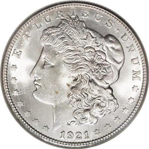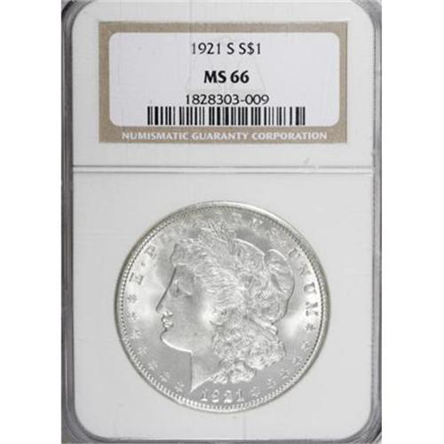 <B>1921-S $1 MS66 NGC.</B></I> In spite of its mintage of more than 21 million pieces, high grade examples are seldom encountered of the 1921-S. Only one piece has been certified finer than MS66 by the two major services (1/08). This is a well struck coin with brilliant surfaces that have bright, coruscating mint frost. Census: 46 in 66, 1 finer (1/08).<BR><BR><b>Shipping:</b> Coins & Currency (<a target="_blank" href="http://www.heritageauctions.com/common/shipping.php">view shipping information</a>