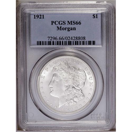 <B>1921<img border='0' src='http://www.heritagecoins.com/images/star.gif' width=10 height=10>$1> MS66 PCGS.</B></I> A bluish-silver cast appears on the surfaces of this stunning and lustrous Premium Gem. Both sides are fine-grained, satiny, and well struck. A few luster grazes on the cheek determine the grade. <BR><BR><B>Important notice:</B> Heritage usually auctions material at the rate of 200-250 lots per hour. On some occasions eBay Live bid software or the Internet may not be able to keep up with the pace of the auction. We recommend placing a realistic absentee bid now as insurance to avoid disappointment. Occasionally the auctioneer may eliminate or reject an eBay Live bid, and the auctioneer may also reopen a lot after the close of the eBay live bidding (usually because we missed an audience bid), and may reject your bid even if it shows you as the winning bidder. By bidding via eBay Live, you agree that Heritage may award the lot to another bidder at its sole discretion under the circumstances described above or any other reasonable circumstances. Since eBay bids are not shown to us until we open the lot on the floor, we treat those bids just like floor bids. In most cases the floor responds before the eBay bid is presented to us, due to Internet lag time, so for consistency we have made it a policy that floor bids are always considered first over tie eBay live bids. Also please note that all Heritage lots purchased through eBay Live carry a 20% Buyer's Premium. Please make sure you read the Terms and Conditions before you bid. This lot is being auctioned in conjunction with a live floor auction by Heritage Galleries & Auctioneers. All final auction and invoice information will be supplied by Heritage Galleries & Auctioneers, and all other information should be considered preliminary. Lot:3793 <BR><BR><B>Winning Notification and Billing:</B> After the FINAL session in this auction is complete, Heritage will send e-mail and snail mail invoices. This process normally takes several days. All final auction and invoice information will be supplied by Heritage Galleries & Auctioneers, and all other information should be considered preliminary. <BR><BR>This auction will be conducted on a live auction floor and over the Internet through eBay Live. If you choose to place an absentee bid, please take a moment to <font color='#0000ff'><u><a href='http://pages.ebay.com/liveauctions/help/before/laabsentee.html'>learn how eBay Live absentee bidding works</a></u></font><font color='#000000'>