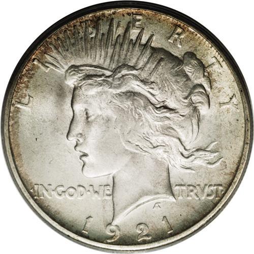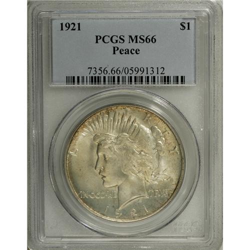 <B>1921 S$1 MS66 PCGS.</B></I> An ivory Gem, this piece is impressive for its satiny silver luster and speckled gold toning. Although slight central weakness can be seen on each side, the strike is sharper than normally encountered on this high relief issue. Census: 87 in 66, 6 finer (12/06).<BR><BR><b>Shipping:</b> Coin/Currency (<a target="_blank" href="http://www.heritageauctions.com/common/shipping.php">view shipping information</a>)