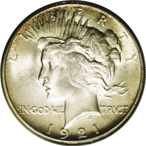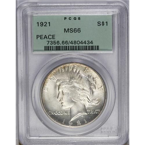 <B>1921<img border='0' src='http://www.heritagecoins.com/images/star.gif' width=10 height=10>$1> MS66 PCGS.</B></I> Booming luster and light golden-brown toning announce the eye appeal of this nearly unabraded Premium Gem. Slightly soft in the centers, as almost always seen. A beautiful example of this one-year high relief subtype. Encapsulated in a green label PCGS holder. PCGS has certified just five pieces finer (6/06).