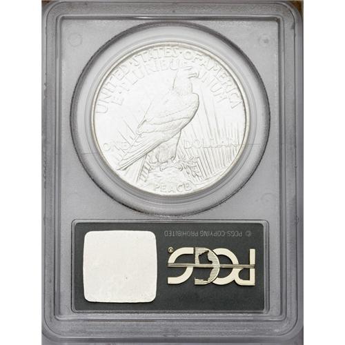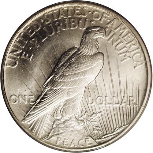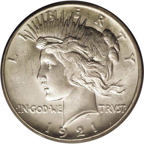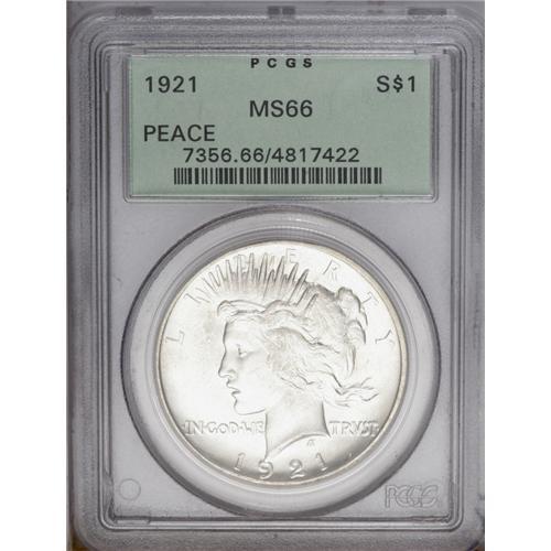 <B>1921<img border='0' src='http://www.heritagecoins.com/images/star.gif' width=10 height=10>$1> MS66 PCGS.</B></I> Gentle olive and sky-blue tints visit the lustrous fields and devices. The majority of Uncirculated 1921 Peace dollars have mushy hair detail over Liberty's ear, since that highpoint is opposite another on the reverse, above the junction of the eagle's leg and wing. But the present piece has impressive central definition, and both the portrait and the reverse are refreshingly unabraded. Encased in a green label holder. Population: 128 in 66, 5 finer (2/06).