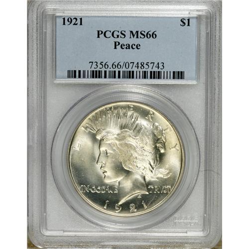 <B>1921 S$1 MS66 PCGS.</B></I> The typical 1921 Peace dollar, with its high relief design, shows considerable central weakness on both sides. However, this piece is far sharper than usual with nearly full central details. The surfaces are exceptional, displaying frosty silver luster and intense cartwheels. Wispy splashes of light gold toning add to the overall aesthetic appeal. While Premium Gem specimens are not particularly rare, they do represent the best quality that is reasonably attainable. Superb Gem MS67 coins are virtually impossible to locate. For instance, PCGS has only certified five finer examples in 20 years of grading numismatic objects (1/07).<BR><BR><b>Shipping:</b> Coins & Currency (<a target="_blank" href="http://www.heritageauctions.com/common/shipping.php">view shipping information</a>)