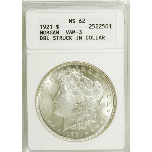 <B>1921 S$1 Morgan Dollar--Double Struck in Collar--MS62 ANACS.</B></I> VAM-3. This piece was struck twice by the dies, and rotated two or three degrees clockwise between the impressions. A fully lustrous and lightly toned mint error. The strike is unusually sharp for a 1921-dated Morgan dollar, which usually shows softness on the cheek and wreath.<BR><I>From The Pacific Coast Mint Error Collection.</B></I><BR><BR><b>Shipping:</b> Coins & Currency (<a target="_blank" href="http://www.heritageauctions.com/common/shipping.php">view shipping information</a>)