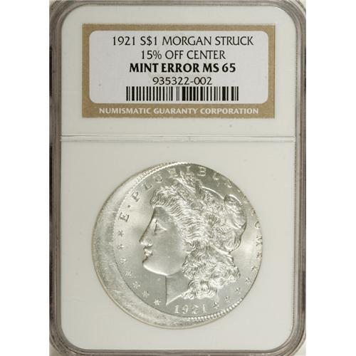 <B>1921 S$1 Morgan Dollar--Struck 15% Off Center--MS65 NGC.</B></I> Struck off center toward 2 o'clock, taking about half of UNUM off the flan. The remaining right side legends are mostly intact. A wide band of unstruck surface is centered at 8 o'clock. A brilliant and thoroughly lustrous Gem. The strike is exceptionally sharp for a 1921-dated Morgan dollar, particularly on the wreath.<BR><BR><b>Shipping:</b> Coins & Currency (<a target="_blank" href="http://www.heritageauctions.com/common/shipping.php">view shipping information</a>)