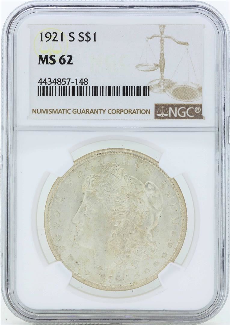 One 1921-S $1 Morgan Silver Dollar Coin NGC MS62. NGC Certified.