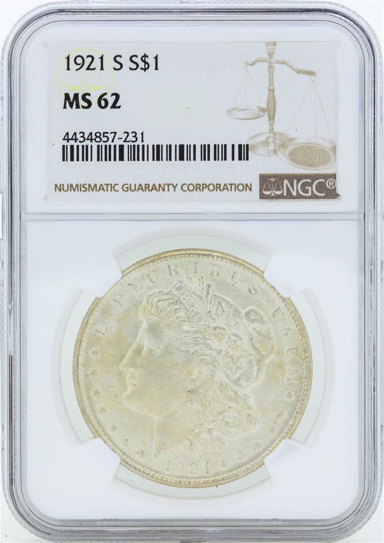 One 1921-S $1 Morgan Silver Dollar Coin NGC MS62. NGC Certified.