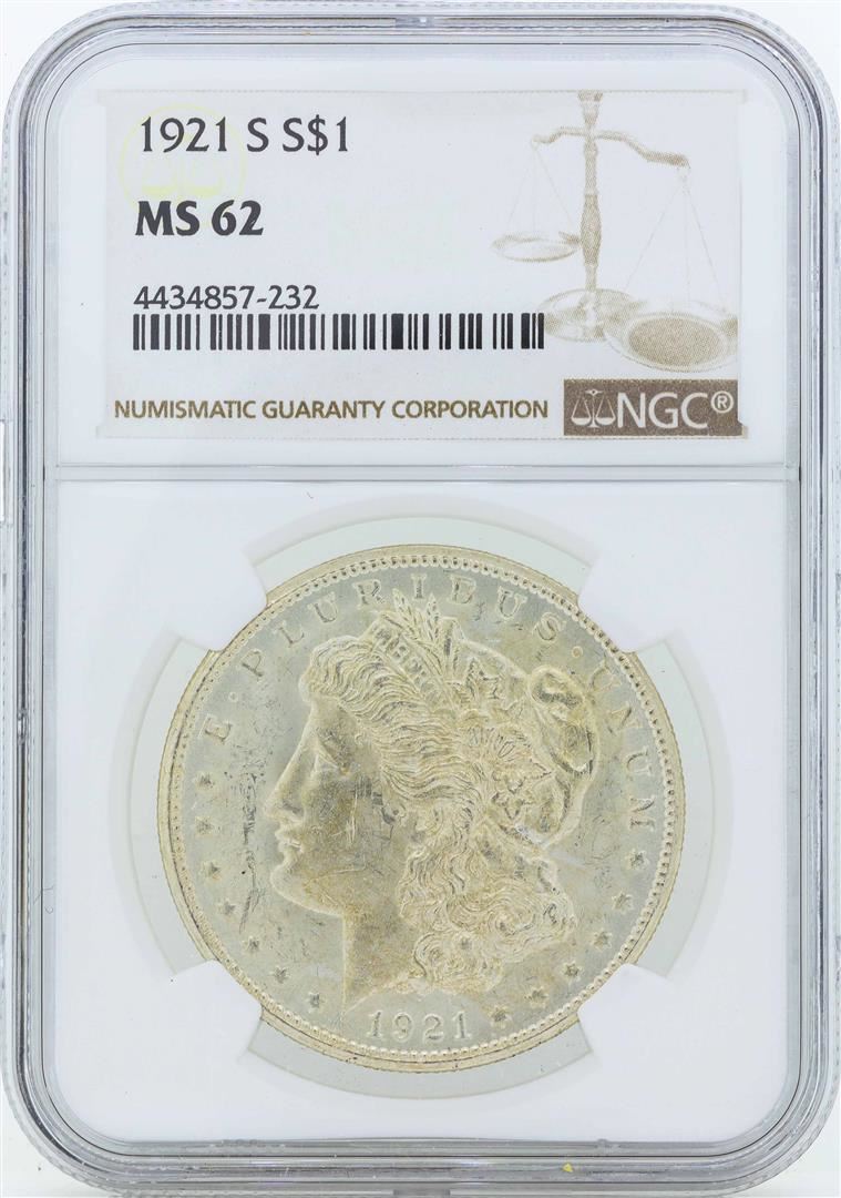 One 1921-S $1 Morgan Silver Dollar Coin NGC MS62. NGC Certified.