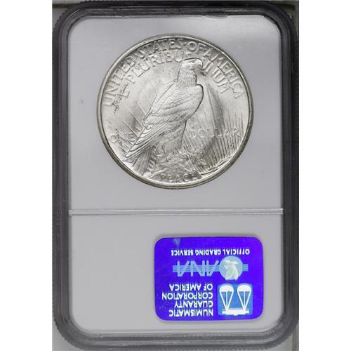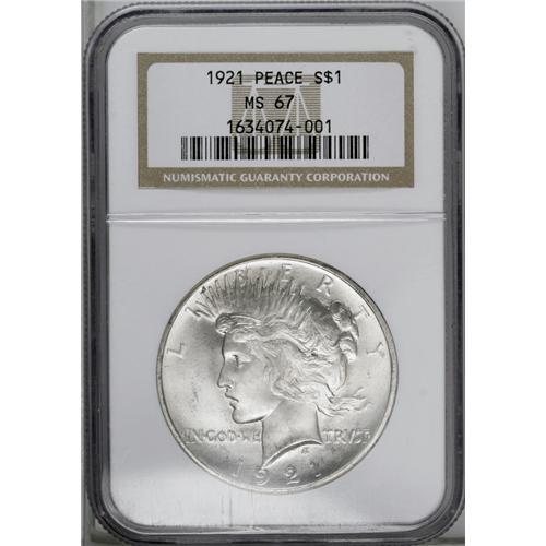 <B>1921<img border='0' src='http://www.heritagecoins.com/images/star.gif' width=10 height=10>$1> MS67 NGC.</B></I> In addition to being the first year of issue for the new Peace dollar design, the 1921 is also the only year this design was struck in high relief, save for a handful of 1922 matte proof examples. For some reason unknown to us, the High Relief double eagle has always received accolades from collectors, even in the year of issue, but the High Relief Peace dollar is greeted with little more than a yawn by most numismatists. Just over a million pieces were produced in December 1921, and as one would expect, high grade, well struck examples are now very elusive. This piece shows strong striking details for the issue with rich, frosted mint luster liberally coating the surfaces. Each side presents a fully brilliant, snow-white appearance as if this coin had been recently struck. As expected of the assigned Superb grade, there are no mentionable marks or other distractions. A conditionally rare example worthy of a close look and a spirited bid. Census: 6 in 67, none are finer (3/06).<BR><I>From The Robert Moreno Registry Collection of Peace Dollars.</B></I>