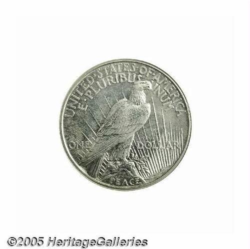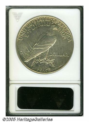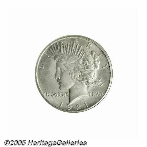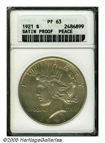 <B>1921<S$1> Satin Finish PR63 ANACS.</B></I> The completeness of strike on this coin should be enough to alert the astute Peace Dollar collector that there is something unusual about this coin. Business strikes, as a rule, do not show the fine detailing seen on this piece. The matte proof variant of the 1921 is less well known, and were struck after the Satin Finish proofs. Neither Breen, Miller, nor Bowers lists any diagnostics for matte proofs other than the extraordinary sharpness of strike and difference in finish. The surfaces on this piece are subdued and show a fine-grain texture when examined under a loupe. Breen (1977) lists five pieces on the roster of known specimens and Bowers (1993) speculates that as many as 10 may exist. In addition to the finely detailed strike on each side, the coin is nearly brilliant with just the slightest accent of gray-golden patina over the obverse. Close examination with a loupe reveals a couple of tiny contact marks on Liberty's eyebrow, but the only ones that might show up in a photograph (and aid in tracing this coin's pedigree) are a pair of parallel vertical abrasions on her lower jaw.