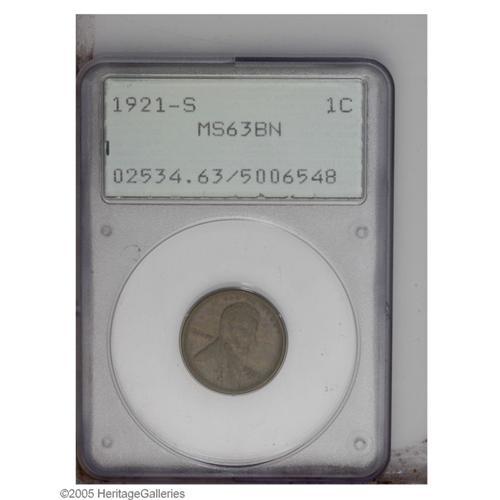 1921-S 1C MS63 Brown PCGS. Medium brown surfaces displ 1921-S[1C] MS63 Brown PCGS.