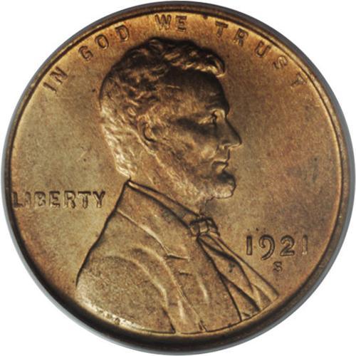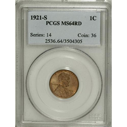 <B>1921-S 1C MS64 Red PCGS.</B></I> Boldly struck and highly lustrous, this near-Gem features attractive mint red color and just a few small surface blemishes that prevent a full Gem grade. A planchet lamination (as struck) is noted on the outer edge of the right reverse wheat ear, and several grease streaks (as made) occur, near the right and upper borders. Population: 87 in 64, 16 finer (3/07).<BR><BR><b>Shipping:</b> Coins & Currency (<a target="_blank" href="http://www.heritageauctions.com/common/shipping.php">view shipping information</a>)