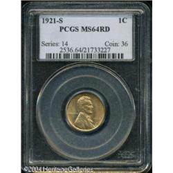 1921-S 1C MS64 Red PCGS. Surfaces are a lustrous c <B>1921-S 1C MS64 Red PCGS.</B></I> Surfaces are a lustrous copper-gold, and display sharply struck devices. A few minute marks are noted on the upper reverse. Population: 86 in 64, 16 finer (10/04). <BR><BR><B>Important notice:</B> Heritage usually auctions material at the rate of 200-250 lots per hour. On some occasions eBay Live bid software or the Internet may not be able to keep up with the pace of the auction. We recommend placing a realistic absentee bid now as insurance to avoid disappointment. Occasionally the auctioneer may eliminate or reject an eBay Live bid, and the auctioneer may also reopen a lot after the close of the eBay live bidding (usually because we missed an audience bid), and may reject your bid even if it shows you as the winning bidder. By bidding via eBay Live, you agree that Heritage may award the lot to another bidder at its sole discretion under the circumstances described above or any other reasonable circumstances. Since eBay bids are not shown to us until we open the lot on the floor, we treat those bids just like floor bids. In most cases the floor responds before the eBay bid is presented to us, due to Internet lag time, so for consistency we have made it a policy that floor bids are always considered first over tie eBay live bids. Also please note that all Heritage lots purchased through eBay Live carry a 20% Buyer's Premium. Please make sure you read the Terms and Conditions before you bid. This lot is being auctioned in conjunction with a live floor auction by Heritage Galleries & Auctioneers. All final auction and invoice information will be supplied by Heritage Galleries & Auctioneers, and all other information should be considered preliminary. Lot:5287