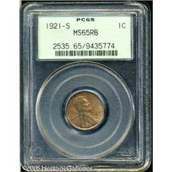 <B>1921-S 1C MS65 Red and Brown PCGS.</B></I> The obverse is streaked in olive-brown toning that imparts a woodgrain appearance that is not uncommon for San Francisco Mint Cents from this era, while the reverse is an even golden-brown. Perfect for inclusion in a date set of Gem Lincoln Cents. Population: 36 in 65, 0 finer (1/05). Lot:5471