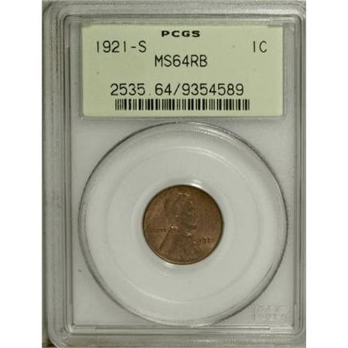 <B>1921-S 1C MS64 Red and Brown PCGS.</B></I> PCGS Population (181/37). NGC Census: (88/33). Mintage: 15,274,000. Numismedia Wsl. Price for NGC/PCGS coin in MS64: $312. (#2535)<BR><BR><B>Coin Engraver:</B> Victor D. Brenner<BR><BR><b>Shipping:</b> Coins & Currency (<a target="_blank" href="http://www.heritageauctions.com/common/shipping.php">view shipping information</a>)