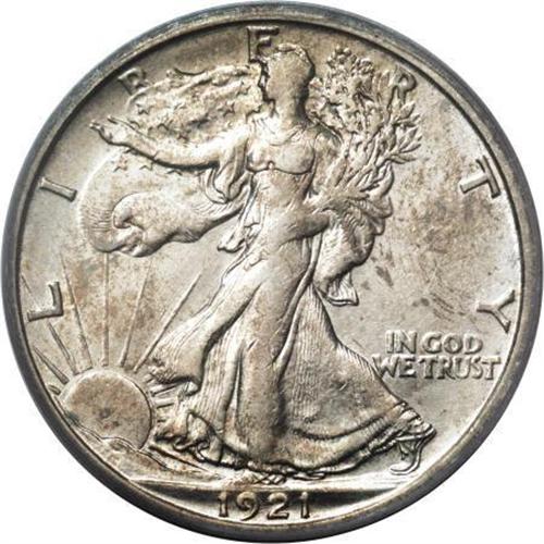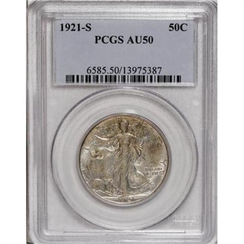 <B>1921-S 50C AU50 PCGS.</B></I> A pleasing example of this conditionally rare issue, which had a low production of just 548,000 pieces. The majority of the half dollars produced this year circulated heavily and only a small percentage the original mintage survives in grades of AU and finer. The surfaces are clean and exhibit more luster than one would expect. Champagne colored surfaces are accented with copper tones at certain places.<BR><BR><B>Coin Engraver:</B> Adolph A. Weinman<BR><BR><b>Shipping:</b> Coins & Currency (<a target="_blank" href="http://www.heritageauctions.com/common/shipping.php">view shipping information</a>)