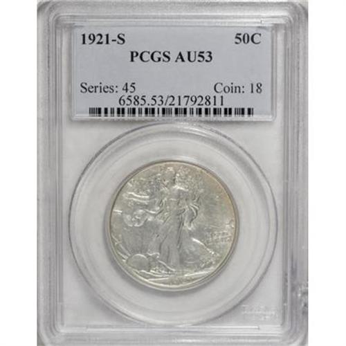 <B>1921-S 50C AU53 PCGS.</B></I> Despite a seemingly small mintage of 548,000 pieces, the 1921-S is actually the <I>most</B></I> available of the Walking Liberty half dollar issues for that year. Still, the 1921-S presents its own set of challenges. In his conversational style, Paul M. Green wrote in the March 7, 2000 edition of <I>Numismatic News</B></I> that the issue was available but tricky: "Actually in circulated grades the 1921-S is not that tough, but watch out if you want a real nice example because they are among the toughest of all Walking Liberty half dollars."<BR> In 2007, collectors recognize just how elusive attractive examples are, particularly in About Uncirculated and better grades. This still-lustrous piece offers subtle ice-blue and champagne shadings over silver-gray surfaces. Minor wear appears on the well struck devices, and a modicum of definition is evident on Liberty's branch hand. Both sides show scattered marks, including a long, thin abrasion in the right obverse field, yet the overall eye appeal remains strong. A wonderful example that would make an excellent addition to a similarly graded collection.<BR><BR><B>Coin Engraver:</B> Adolph A. Weinman<BR><BR><b>Shipping:</b> Coins & Currency (<a target="_blank" href="http://www.heritageauctions.com/common/shipping.php">view shipping information</a>\)