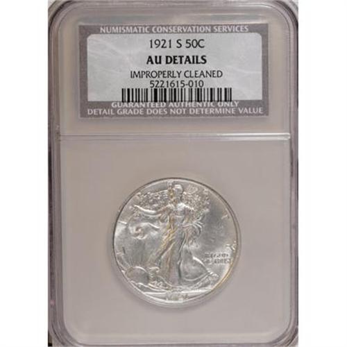 <B>1921-S 50C --Improperly Cleaned--NCS. AU Details.</B></I> The 1921-S Walker is one of the two rarest issues in the entire series, and it is desired by collectors in virtually all grades. This piece, having faint hairlines, would still qualify as a solid AU piece, despite the imperfections.<BR><BR><B>Coin Engraver:</B> Adolph A. Weinman<BR><BR><b>Shipping:</b> Coins & Currency (<a target="_blank" href="http://www.heritageauctions.com/common/shipping.php">view shipping information</a>)