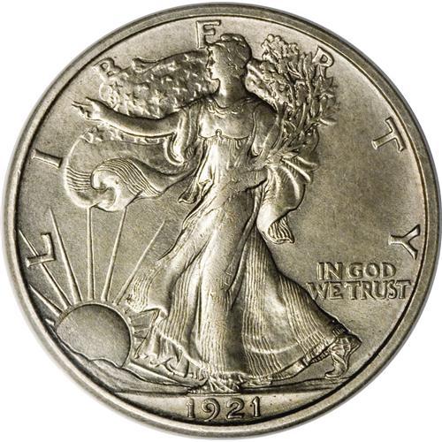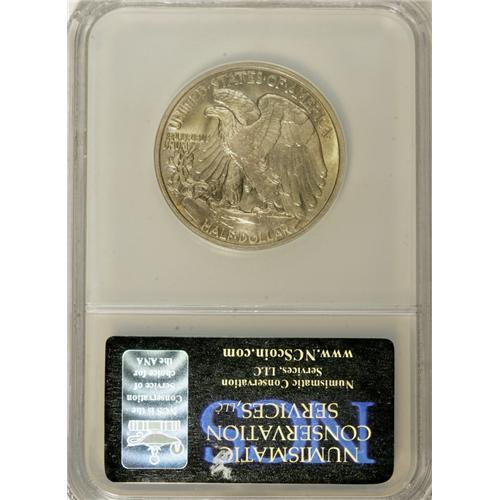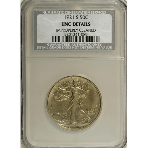 <B>1921-S 50C --Improperly Cleaned--NCS. Unc. Details.</B></I> In Mint State, the 1921-S is the key to the entire series, despite a mintage higher than its Philadelphia and Denver counterparts. Apparently, there were fewer West Coast collectors, and not many examples were set aside. This example has good cartwheel luster, and the lime-green and aqua-blue surfaces are surprisingly unabraded. The strike is incomplete on Liberty's head and branch hand, as usual for the issue, but the eye appeal is reasonable given its mild cleaning.<BR><BR><b>Shipping:</b> Coins & Currency (<a target="_blank" href="http://www.heritageauctions.com/common/shipping.php">view shipping information</a>)