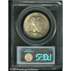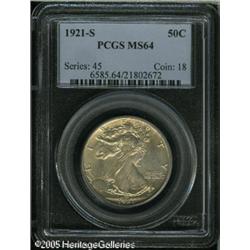 <B>1921-S 50C MS64 PCGS.</B></I> Although not the lowest mintage issue in this series (that honor belongs to the 1921-D), the 1921-S is widely known as the "King of the Walkers." The San Francisco Mint delivered just 548,000 Half Dollars in 1921, virtually all of which were placed directly into circulation. As a result, this date is easily obtainable in low circulated grades like Good, Very Good, and Fine. At the AU level of preservation, the '21-S is rare, and Mint State coins are even more so. This issue is not known for sharply struck features, a fact that only increases its conditionally challenging status. The present near-Gem exhibits average striking definition for the type with a partial overlay of medium golden iridescence on the right half of both the obverse and reverse. There are really very few distracting abrasions; in fact, only a couple of small abrasions on Liberty's skirt are all that keep this coin out of an MS65 holder. The luster appears to be a trifle subdued, but the overall eye appeal is impressive for the issue. A definite highlight of the present collection.<BR><I>From The William & Harrison Hiatt Registry Collection, Part Two.</B></I> Lot:7990