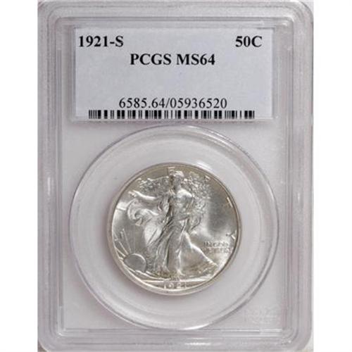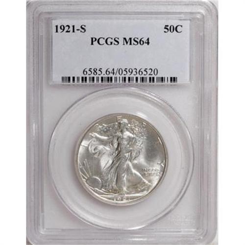 <B>1921-S 50C MS64 PCGS.</B></I> Although President Theodore Roosevelt was no longer in office, the Treasury Department conducted a coinage design competition in response to his desire for all new coinage designs, the same desire that resulted in the Lincoln cent, the Indian gold coins, and the Saint-Gaudens double eagle. Adolph A. Weinman submitted the winning designs for the Mercury dime and the Walking Liberty half dollar, and both designs made their first appearance in 1916.<BR> A condition rarity in the series, the '21-S Walker is elusive in grades better than Fine. Examples that qualify as Mint State are highly desirable, and seldom seen, either in auctions or on bourse floors. The Heritage archives show more than 300 examples of this date offered in all grades, with just 50 of those in MS60 or finer condition, and only 15 pieces better than this example. In his <I>Complete Encyclopedia,</B></I> Walter Breen implied by his comments that only about 20 Mint State examples are known when he said: "Possibly all UNC survivors are from a single roll, mostly weak strikes." While it is evident today that there are more than 20 such pieces, the number of survivors clearly does not exceed the demand for such coins.<BR> This example displays satiny silver luster that is created by microscopic die polish lines in the fields, imparting a reflective appearance. The surfaces are fully brilliant white, save for a trace of gold color on each side. The motifs are relatively sharp, with weakness located at Liberty's head, left hand at the center, and the upper skirt lines. Most of the reverse detail is boldly defined, including all of the breast feathers. Population: 45 in 64, 17 finer (6/07).<BR><BR><b>Shipping:</b> Coins & Currency (<a target="_blank" href="http://www.heritageauctions.com/common/shipping.php">view shipping information</a>)