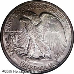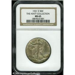 <B>1921-S 50C MS65 NGC.</B></I> Among half dollars coined in the 20th century, the 1921 issues are the rarest, with the 1921-S representing the most important condition rarity of the group. Total mintage of half dollars for the year was 1,002,000 coins, with just over half of these, or 548,000, minted in San Francisco. Author Anthony Swiatek noted that, a few decades earlier, the 1921 (P) half dollar was considered the rarest of this trifecta, with a higher market price in the 1940s. He went on to suggest that some individuals actually removed the mintmark from 1921-S half dollars to increase the perceived value! Of course, such actions a generation ago have only increased the rarity of pristine 1921-S half dollars.<BR> Adolph A. Weinman, who also accomplished the Mercury dime introduced to coinage the same year, prepared this design. A few years earlier, President Theodore Roosevelt was disgusted with the coin designs in circulation at the time, and made it his mission to have all the coinage redesigned. Roosevelt was especially interested in the gold coinage, commissioning Augustus Saint-Gaudens to prepared new designs for the eagle and double eagle. Bela Lyon Pratt concentrated on new designs for the quarter and half eagle denominations. At about the same time, Roosevelt contacted Victor David Brenner to prepare a coinage design for the cent, based on the artist's earlier plaque honoring President Abraham Lincoln. This left only the nickel and the silver denominations to be redesigned. The nickel had its turn in 1913, and finally, the silver coins in 1916. The Liberty Walking half dollar design is considered by many to be the most beautiful silver coinage design ever produced by the United States, and one of the two most beautiful of all coinage designs along with the Saint-Gaudens double eagle. Even the United States government gave a nod to these designs, choosing each for the recent American Eagle gold and silver coins introduced in 1986.<BR> It was not until the 1930s that collecting 20th century coinage by date became an important collecting method. Prior to that, numismatists were concerned with 18th and 19th century issues, if they were even interested in United States coinage. Wayte Raymond produced his "National" line of coin albums during the depression, an era of significant numismatic interest. Once collectors had an album, and knew what issues to seek, collecting the earlier issues by date and mintmark gained in popularity. This was also the time when the true rarity of some branch mint issues was first recognized. Beginning with the 1933 and 1934 Liberty Walking half dollars, interest was such that many of these were saved at or near the time of issue and survive today in high grade. Earlier issues were not saved at the time of issue to any large degree and, today, all dates from 1916 through 1929 are elusive in the highest grades.<BR> This is a splendid Gem example with fully lustrous satiny surfaces on both sides. The obverse has pale heather coloration, with a splash of intermingled champagne and steel at the lower obverse. The highest design points are weakly impressed, as so often on these coins. Original tiny planchet marks are seen across the high points, and these existed at the time this coin was struck. Original blank planchets had numerous tiny surface marks, and through the pressure applied by the coining presses, those marks were generally eliminated when a coin was struck. If the pressure was not sufficient, however, the marks would not be erased. The reverse is similar with satiny luster, pale heather toning, and faint golden-brown highlights. Although not fully defined, most of the design elements are sharply impressed. While PCGS and NGC have combined to certify 39 examples of this issue at the Gem MS65 grade level, only two finer coins have been certified. Population: 19 in 65, 1 finer (1/05).<BR><I>From The William & Harrison Hiatt Registry Collection, Part Two.</B></I> Lot:7991