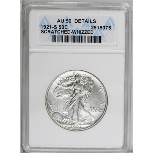 <B>1921-S 50C --Scratched, Whizzed--ANACS. AU50 Details.</B></I> Typically struck with lightly worn and surreally bright surfaces. The eagle has several scratches on its breast.<BR><BR><b>Shipping:</b> Coin/Currency (<a target="_blank" href="http://www.heritageauctions.com/common/shipping.php">view shipping information</a>)