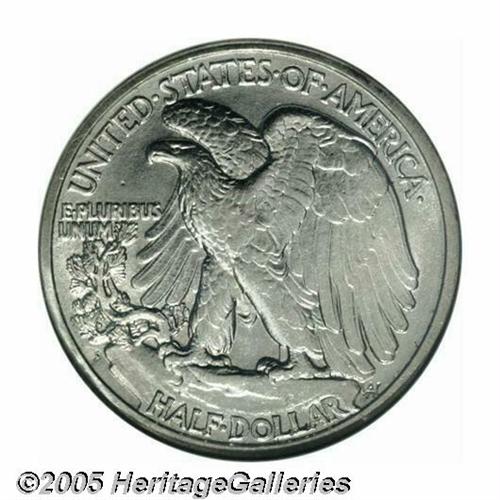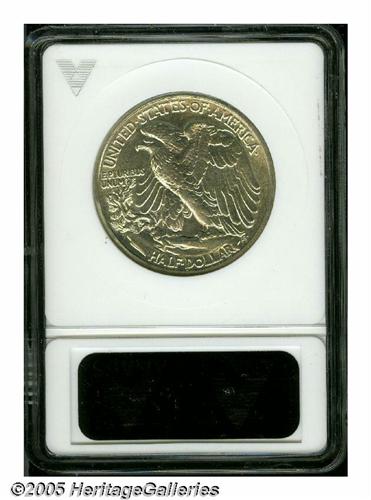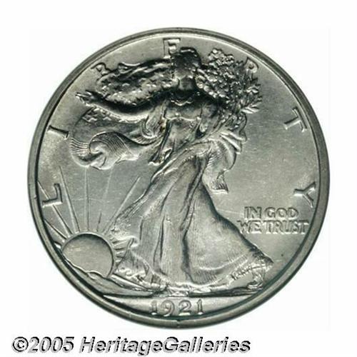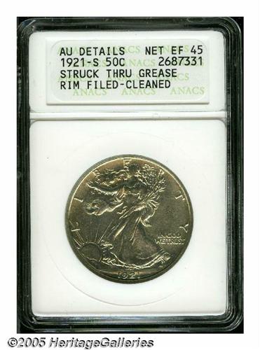 <B>1921-S<50C>--Struck Through Grease, Rim Filed, Cleaned--ANACS. AU Details, Net XF45.</B></I> Perhaps the most unfortunate circumstance surrounding this key Walking Liberty issue is not the fact that it was struck through grease, but <B>where</B></I> it was struck through grease. Much of the mintmark is obliterated by this planchet imperfection and rim filing in the vicinity is perhaps an ill-advised attempt smooth out to the irregular area. Bright, untoned surfaces are essentially without wear.