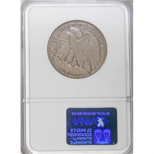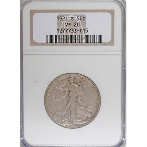 <B>1921-S 50C VF20 NGC.</B></I> Rich rose, gold, and orange patina drapes the moderately worn surfaces of this Walking Liberty key. The devices show no distracting abrasions, though scattered, wispy marks are present in the fields.<BR><BR><B>Coin Engraver:</B> Adolph A. Weinman<BR><BR><b>Shipping:</b> Coins & Currency (<a target="_blank" href="http://www.heritageauctions.com/common/shipping.php">view shipping information</a>)