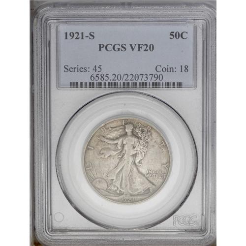 <B>1921-S 50C VF20 PCGS.</B></I> This popular key date has pleasing light gray toning with hints of gold undertones. Nicely defined on the design elements, and remarkably clean surfaces for a circulated coin.<BR><BR><b>Shipping:</b> Coin/Currency (<a target="_blank" href="http://www.heritageauctions.com/common/shipping.php">view shipping information</a>)