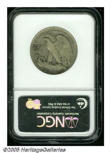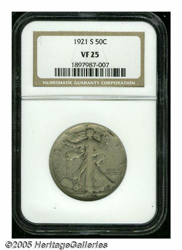 <B>1921-S<50C> VF25 NGC.</B></I> Natural light gray color with minor abrasions as expected. Although common in the lowest grade, examples of this issue grading better than Fine are elusive.