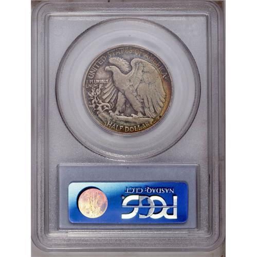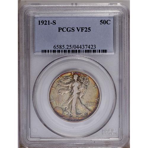 <B>1921-S 50C VF25 PCGS.</B></I> Rich green, gold, and red peripheral toning is seen on both sides. Typically worn for the grade, with a handful of contact marks on the obverse, and a generally pleasing appearance for the grade. An important key date in the Walking Liberty half dollar series.