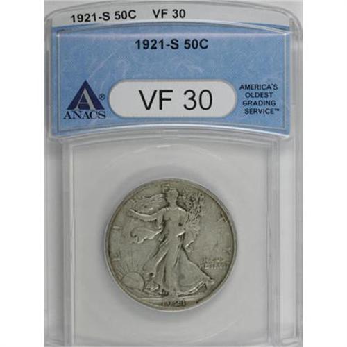 <B>1921-S 50C VF30 ANACS.</B></I> An attractive mid-range example of this popular low-mintage issue, silver-gray in the centers with hints of blue and a measure of orange patina at the reverse margins. Minimally marked and pleasing.<BR><BR><B>Coin Engraver:</B> Adolph A. Weinman<BR><BR><b>Shipping:</b> Coins & Currency (<a target="_blank" href="http://www.heritageauctions.com/common/shipping.php">view shipping information</a>)