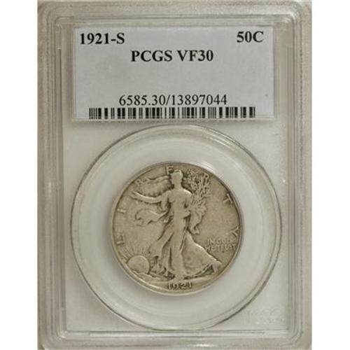 <B>1921-S 50C VF30 PCGS.</B></I> A moderately worn silver-gray example of this lower-mintage Harding Administration issue. The surfaces show few marks for the grade, though deeper patina is present near the devices. An attractive representative of this early West Coast Walker.<BR><BR><B>Coin Engraver:</B> Adolph A. Weinman<BR><BR><b>Shipping:</b> Coins & Currency (<a target="_blank" href="http://www.heritageauctions.com/common/shipping.php">view shipping information</a>\)
