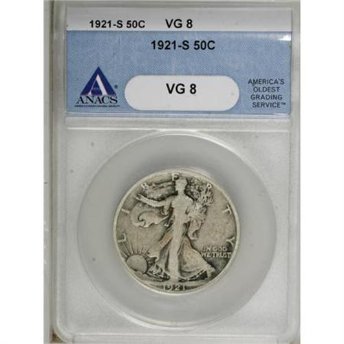 <B>1921-S 50C VG8 ANACS.</B></I> NGC Census: (35/407). PCGS Population (51/519). Mintage: 548,000. Numismedia Wsl. Price for NGC/PCGS coin in VG8 : $56. (#6585)<BR><BR><B>Coin Engraver:</B> Adolph A. Weinman<BR><BR><b>Shipping:</b> Coins & Currency (<a target="_blank" href="http://www.heritageauctions.com/common/shipping.php">view shipping information</a>)
