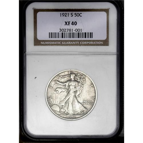 <B>1921-S<50C> XF40 NGC.</B></I> An original medium-gray example of this low mintage Walking Liberty issue, almost always found in AG or Good condition and emerging as rare as the grade reaches XF. Deeper charcoal accents are seen in the most protected areas. <BR><BR><B>Important notice:</B> Heritage usually auctions material at the rate of 200-250 lots per hour. On some occasions eBay Live bid software or the Internet may not be able to keep up with the pace of the auction. We recommend placing a realistic absentee bid now as insurance to avoid disappointment. Occasionally the auctioneer may eliminate or reject an eBay Live bid, and the auctioneer may also reopen a lot after the close of the eBay live bidding (usually because we missed an audience bid), and may reject your bid even if it shows you as the winning bidder. By bidding via eBay Live, you agree that Heritage may award the lot to another bidder at its sole discretion under the circumstances described above or any other reasonable circumstances. Since eBay bids are not shown to us until we open the lot on the floor, we treat those bids just like floor bids. In most cases the floor responds before the eBay bid is presented to us, due to Internet lag time, so for consistency we have made it a policy that floor bids are always considered first over tie eBay live bids. Also please note that all Heritage lots purchased through eBay Live carry a 20% Buyer's Premium. Please make sure you read the Terms and Conditions before you bid. This lot is being auctioned in conjunction with a live floor auction by Heritage Galleries & Auctioneers. All final auction and invoice information will be supplied by Heritage Galleries & Auctioneers, and all other information should be considered preliminary. Lot:2931 <BR><BR><B>Winning Notification and Billing:</B> After the FINAL session in this auction is complete, Heritage will send e-mail and snail mail invoices. This process normally takes several days. All final auction and invoice information will be supplied by Heritage Galleries & Auctioneers, and all other information should be considered preliminary. <BR><BR>This auction will be conducted on a live auction floor and over the Internet through eBay Live. If you choose to place an absentee bid, please take a moment to <font color='#0000ff'><u><a href='http://pages.ebay.com/liveauctions/help/before/laabsentee.html'>learn how eBay Live absentee bidding works</a></u></font><font color='#000000'>