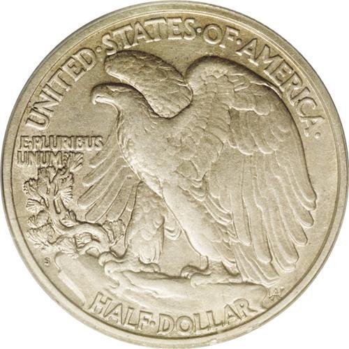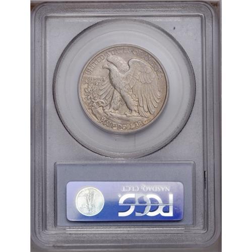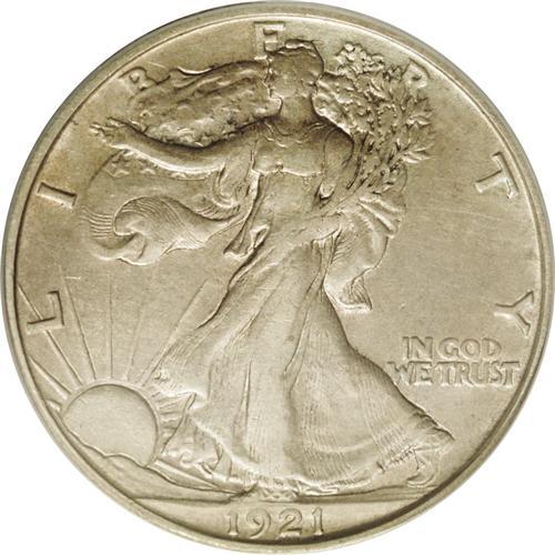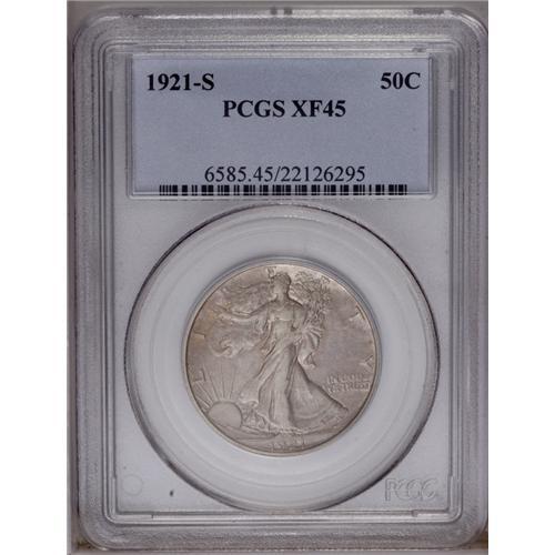<B>1921-S<50C> XF45 PCGS.</B></I> Dusky lavender-gray and gold patina embraces this nicely detailed representative. The right obverse field has a few wispy contact marks, but the surfaces are otherwise attractive and retain hints of the original luster. All silver issues from 1921 are rare, aside from the Morgan Dollars that were produced in vast quantities to fulfill the Pittman Act. Although the 1921-S is the most available of the three Walker issues of that year in typical circulated grades, it is also the most conditionally rare and becomes the key to the series in XF and higher grades.